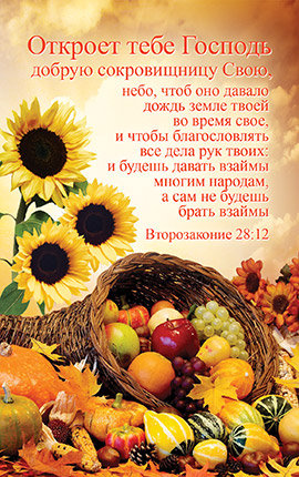 Лицевая сторона: “Откроет тебе Господь добрую сокровищницу Свою, небо, чтоб оно давало дождь земле твоей во время свое, и чтобы благословлять все дела рук твоих: и будешь давать взаймы многим народам, а сам не будешь брать взаймы. Второзаконие 28:12”
